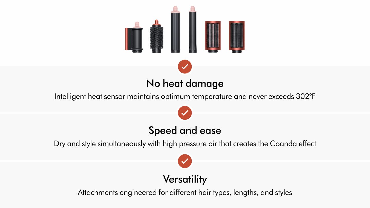 The first multi-styler to use Coanda airflow across its Smoothing brushes, barrels and Dryer+Flyaway smoother. With no heat damage.